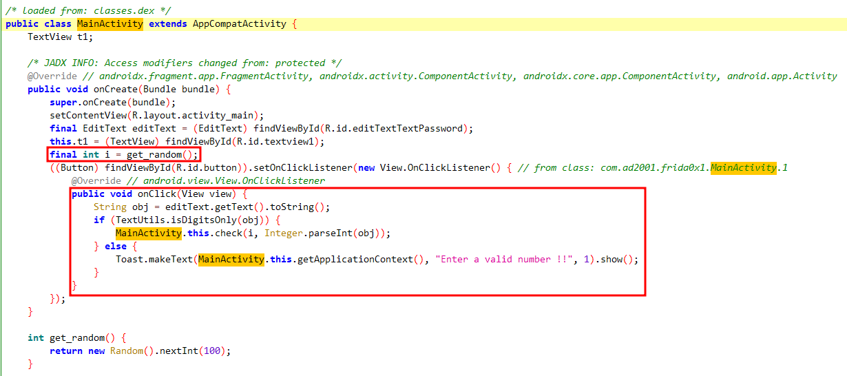 let MainActivity = Java.use("com.ad2001.frida0x1.MainActivity");