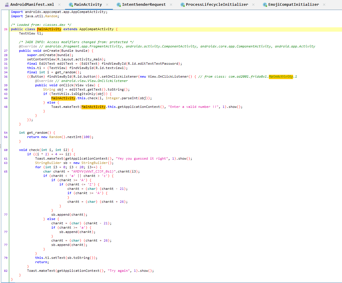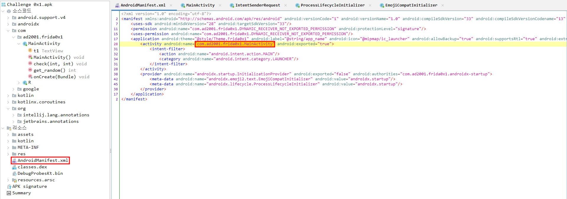 저는 여기서 간단하게 메인액티비티가 존재한다는 점, 패키지 명이 com.ad2001.frida0x1 이라는 점을 확인한 후 넘어갔습니다.