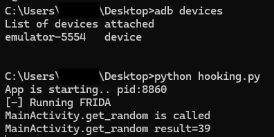 frida란.. frida를 설치해봅시다 pip install frida pip install frida frida-tools frida --version 설치한 frida 버전을 확인한다. getprop ro.product.cpu.abi 에뮬레이터의 비트를 확인한다. 설치한 frida 버전 & 에뮬레이터의