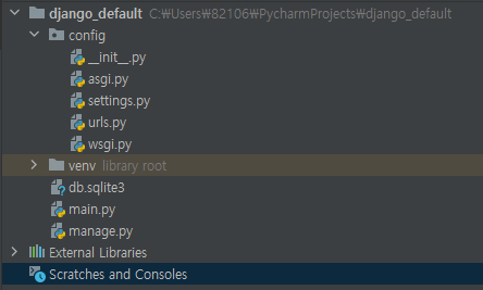 - db.sqlite3 : SQLite3 DB 파일. 임의로 삭제하거나 위치 이동하면 안됨 (다른 DB로 변경할 경우는 필요 없는 파일)