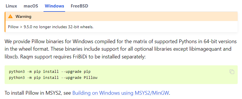 Warnings: Python Support: Pillow supports these Python versions. Newer versions:,,,,,,,,, Python, 3.12, 3.11, 3.10, 3.9, 3.8, 3.7, 3.6, 3.5,,, Pillow >= 10.1, Yes, Yes, Yes, Yes, Yes,,,,, Pillow 10...