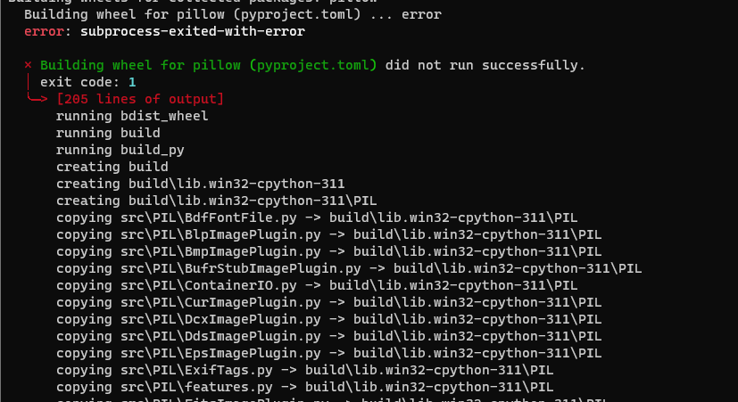 Building wheel for pillow (pyproject.toml) did not run successfully.
