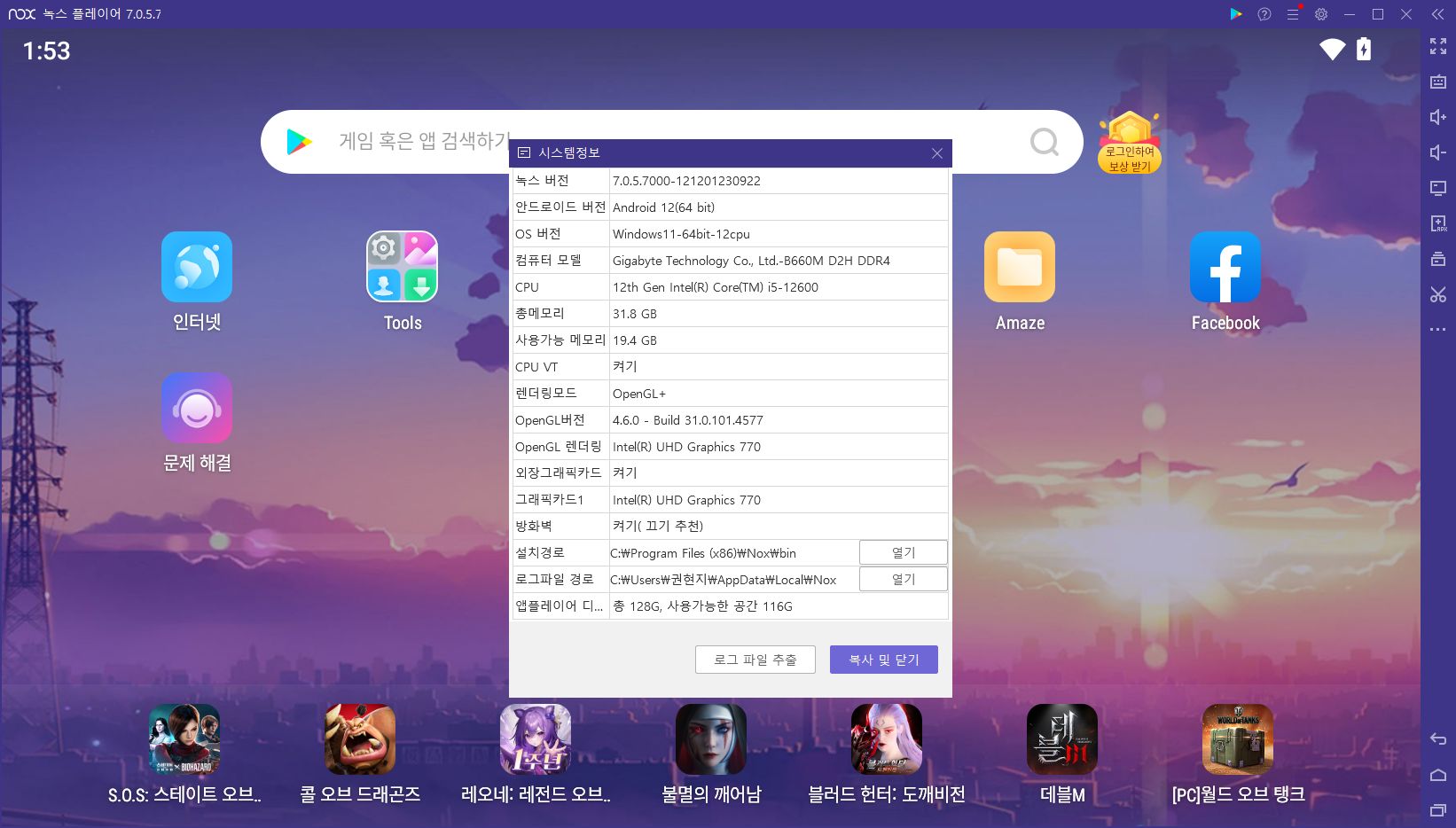 이후 재부팅을 하고, 안드로이드 7 버전의 녹스를 실행시키면 'hyper-v 옵션이 꺼져있다'는 내용의 창이 하나 뜬다.