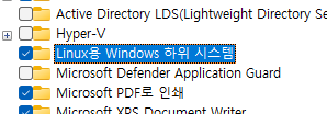 젤 중요한 것은 'Windows 기능 켜기/끄기' 설정에서 Linux용 Windows 하위 시스템을 꺼주는 것이다.