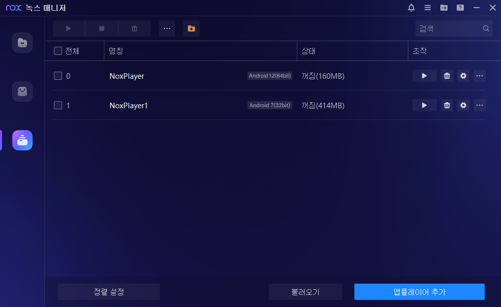 녹스 매니저에서 안드로이드 12와 안드로이드 7 버전을 생성했다.